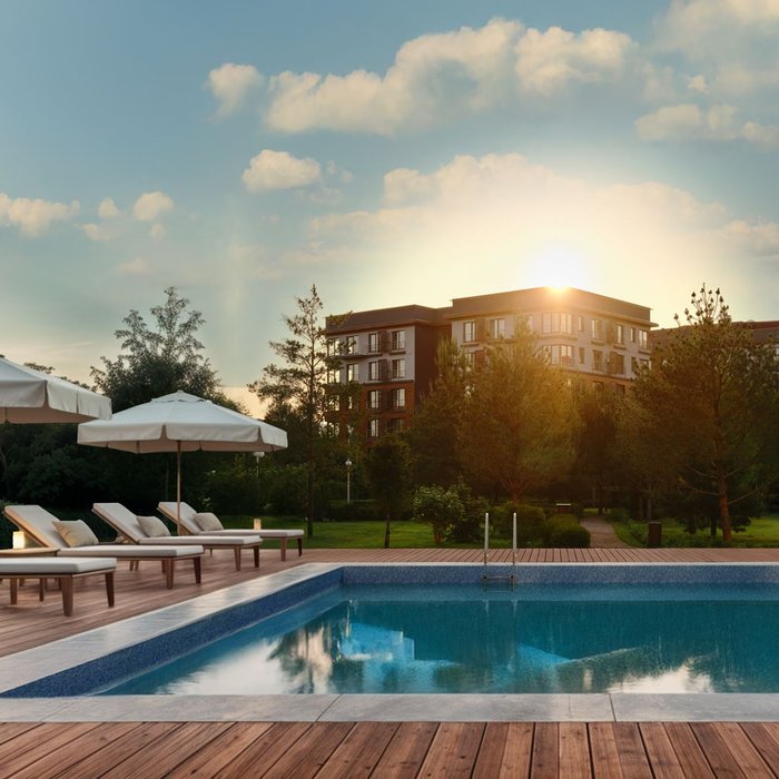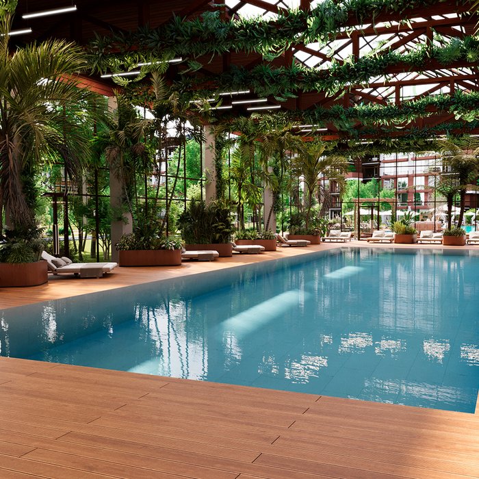 Эксклюзивная привилегия резидентов Vnukovo Country Club — доступ в собственный пляжный клуб общей площадью аквазоны 600 кв. м, где есть всё для релаксации и восстановления в любое время года: уличный подогреваемый бассейн с гриль-баром, крытый бассейн с тропической оранжереей, лаунж-зоны с шезлонгами и купель для малышей.